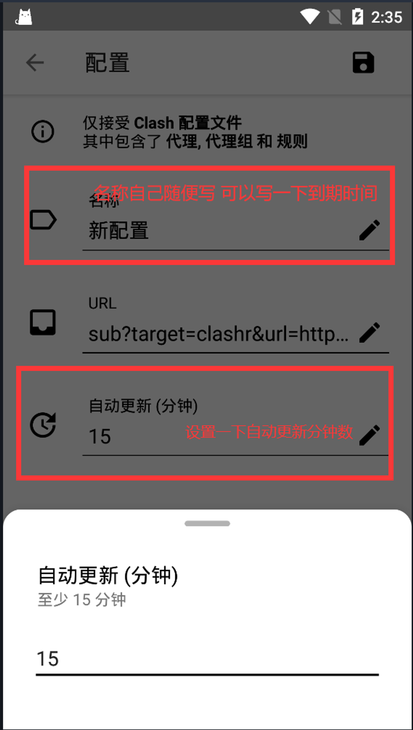 💡 然后将发给你的订阅填写到url这一栏,设置完其他信息后点右上角保存