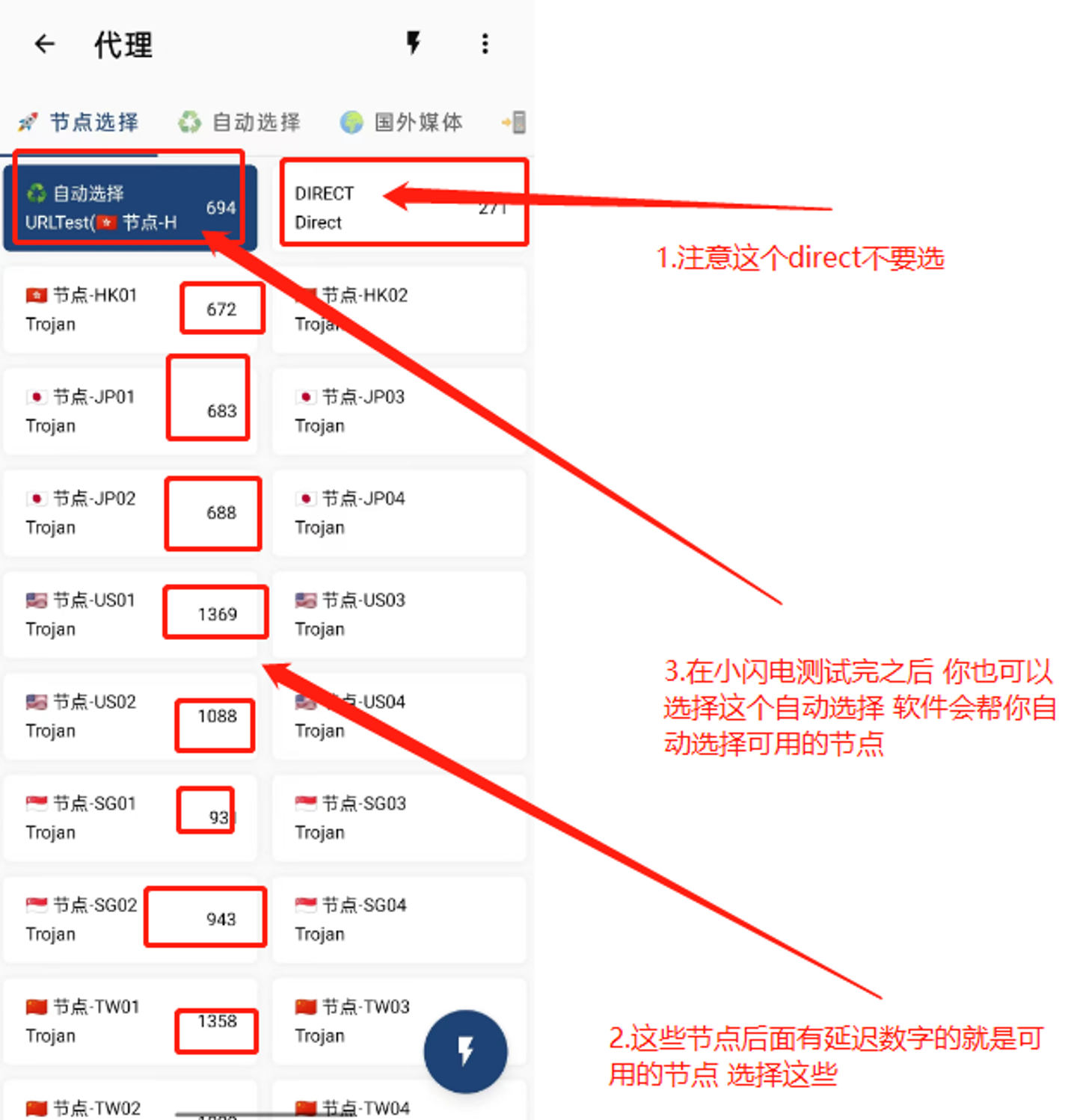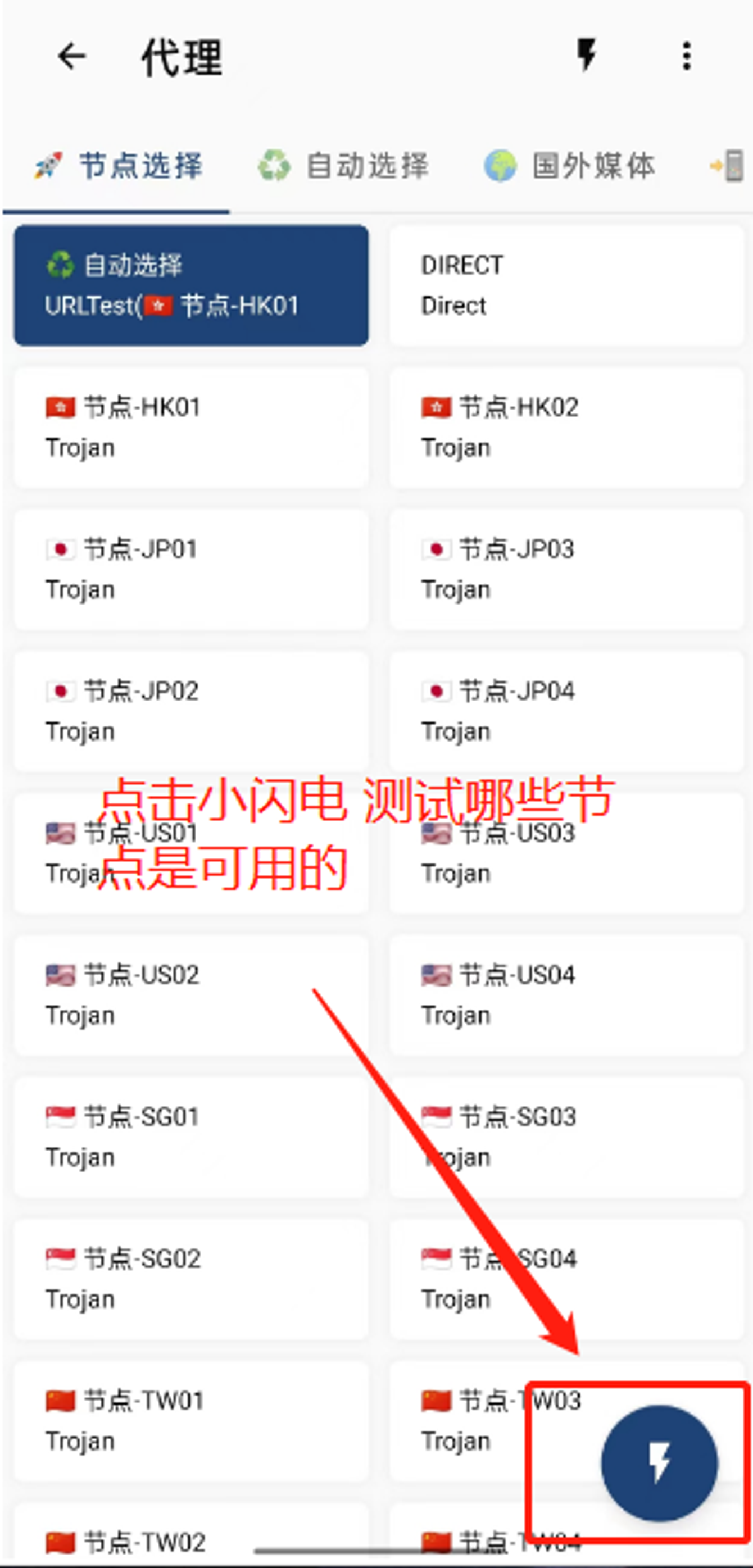 5.点击代理-点击闪电图标测试延迟选择节点(或者选择自动选择)